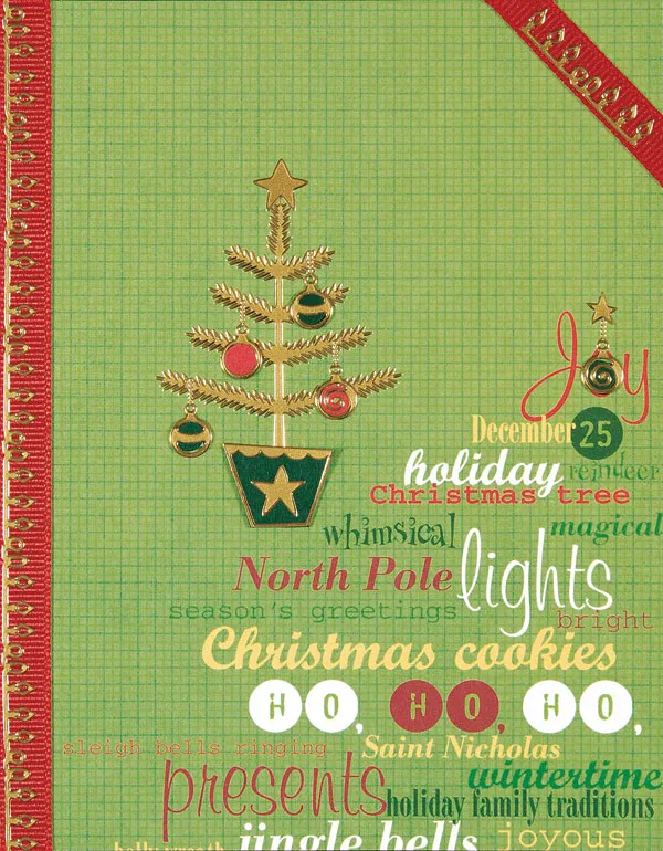 Inside the card: Cut a 1 1/4” strip of words paper and attach across the center of the card. Glue red ribbon across the top. Add a small Tree Dazzle™ and ornament, backed with green paper.