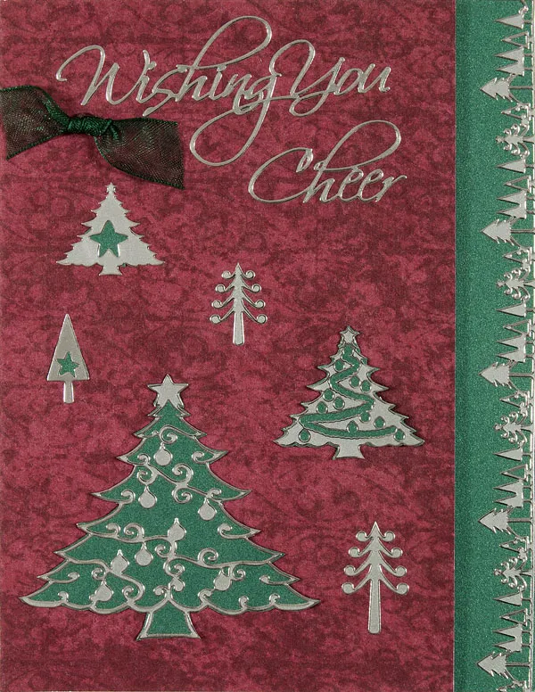 Trim 3/4” off of the front of the card. Cover the card front with red marble paper. Back the Tree Dazzles™ with green glimmer paper and attach to the card front as shown.
