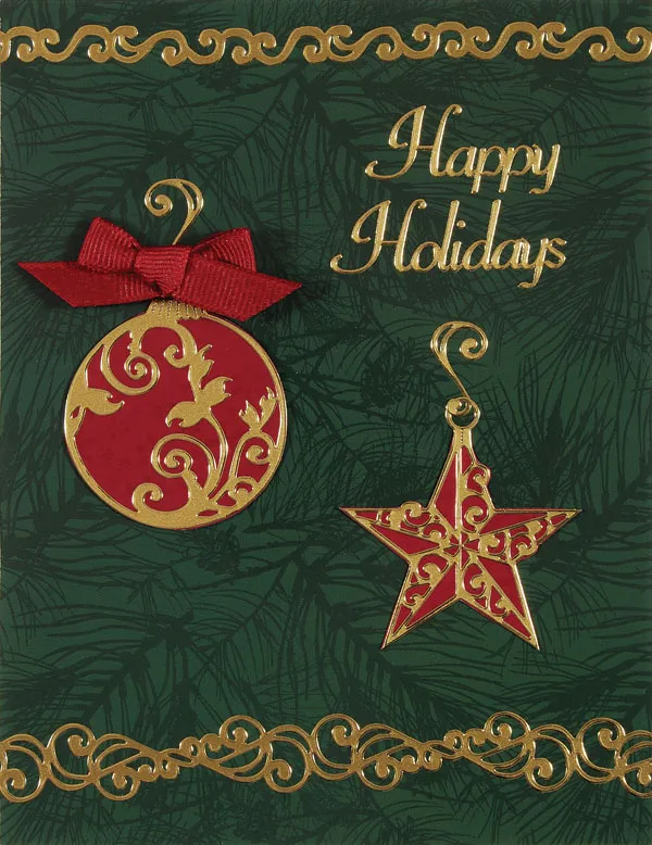 Inside the card: Cut a 3 1/2”x2 1/2” piece of green boughs and mat with red paper. Back an Ornament Dazzle™ with red paper and attach to the mat with a piece of a border and “Joy”.