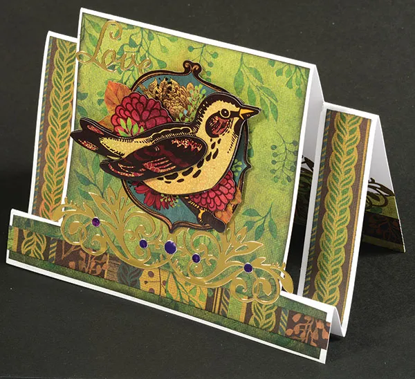 Card Front: Place the Center Step Die-Cut card fold on the top. Trace the front panel pattern onto Serenity green leaves paper, ink edges and glue to the card front. Trace and cut left and right side panels from striped paper, ink edges and glue to the sides, as shown.