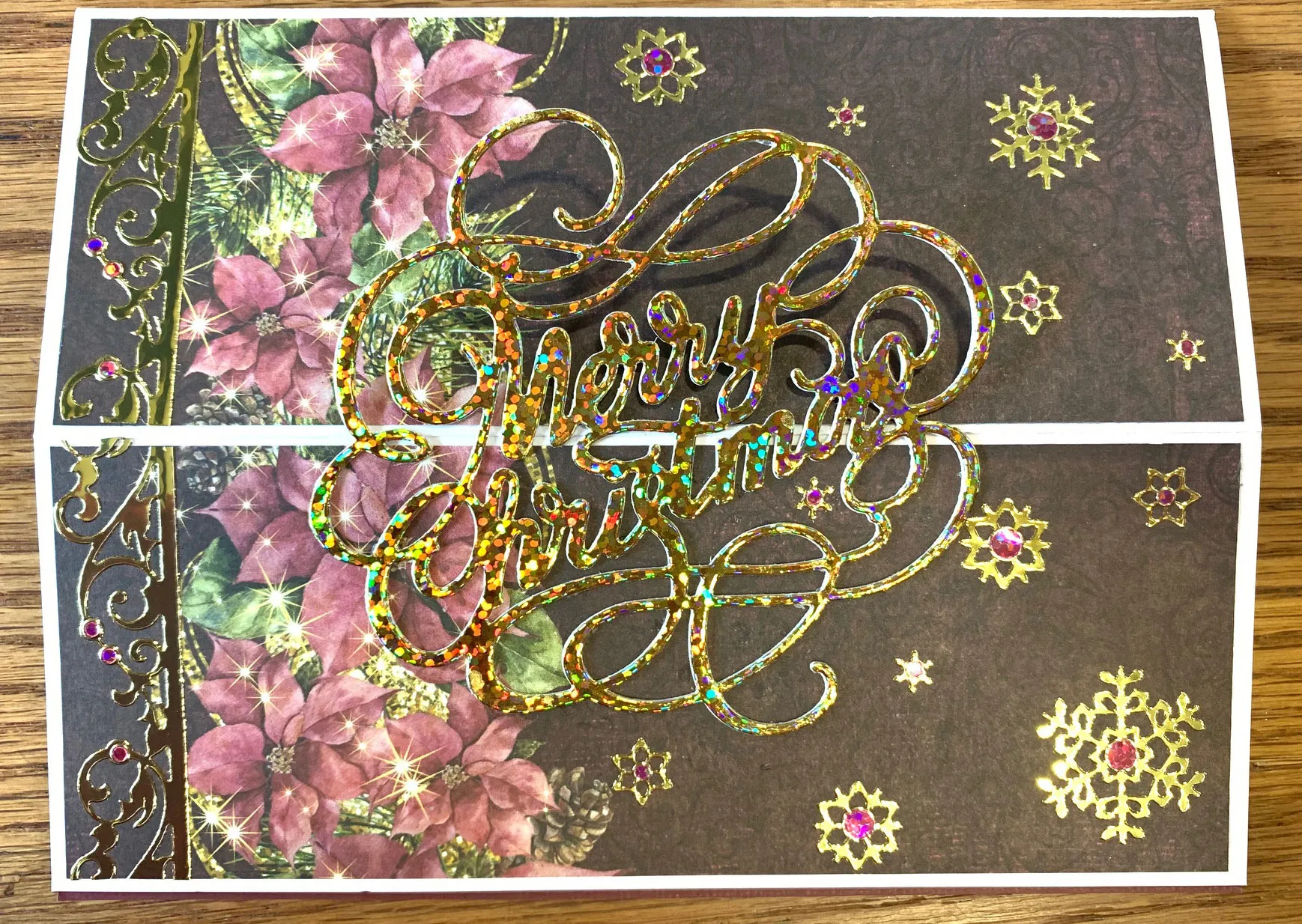 Place snowflake Dazzles™ on the front around the greeting, avoiding the poinsettias. Place jewel Dazzles™ on the snowflakes and the border Dazzles™.