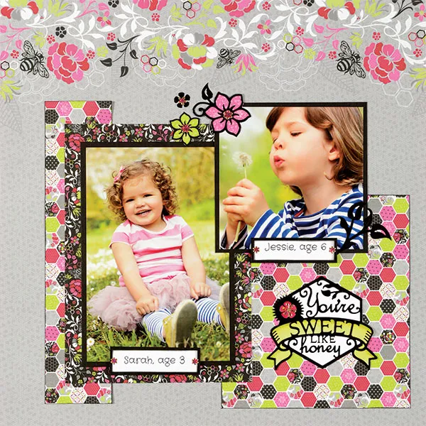 Dazzles™: Both Pages: Back Honeysuckle Scrapbooking Dazzles™ flowers with Honeysuckle pink and green paper. Place Flower Jewel Dazzles™ (included with Honeysuckle Scrapbooking Dazzles™) on the flower centers. Glue to the photo corners along with leaves, as shown. Left Page: Back the “You’re Sweet Like Honey” Honeysuckle Scrapbooking Dazzles™ with white cardstock and color banner with CT1 and CG2 Yellow Spectrum Noir™ pens and the flower with a DR3 Red Spectrum Noir™ pen. Place a Pink Jewel Flower Dazzles™ on the center of the red flower. Cut out image and glue to the bottom right corner of the page.