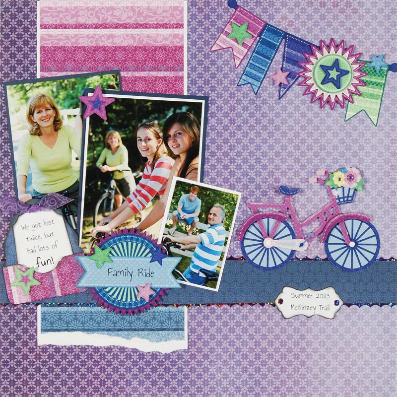 Write or print on white cardstock. Trace with Pick-A-Pocket Persian Label. Ink edges and place Purple Jewel Dazzles™ on each end. Glue to the blue border below the bike.