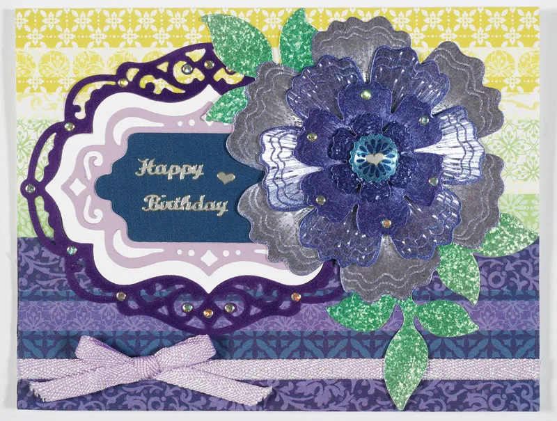 Place “Happy Birthday” from the Tiny Words & Phrases Dazzles™ sheet on the dark blue label as shown. Add a heart near the words and centered on the Papier Tole flower. Decorate the Foil Papier Tole embellishment and die-cut labels with Silver Jewel Dazzles™. Tie a lavender metallic ribbon bow and Zot™ as shown.