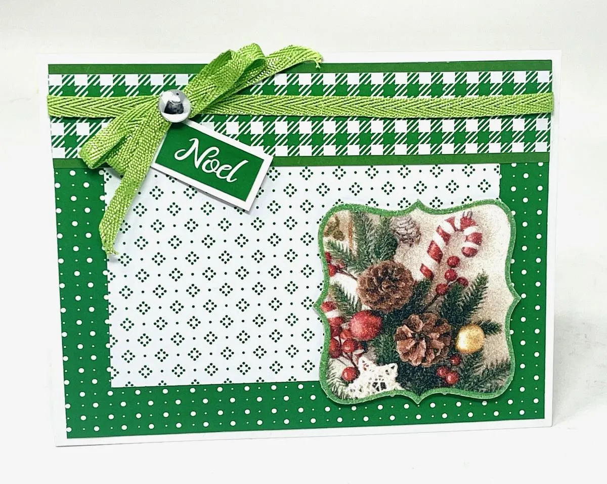 3. Make a 4-loop bow with the lime ribbon and tie the center with thread. Glue it to the first ribbon, 1½" from the left end. Cut out the green “Noel” greeting and mat it on white cardstock with 1/16" borders. Glue and foam tape it extending from under the bow.