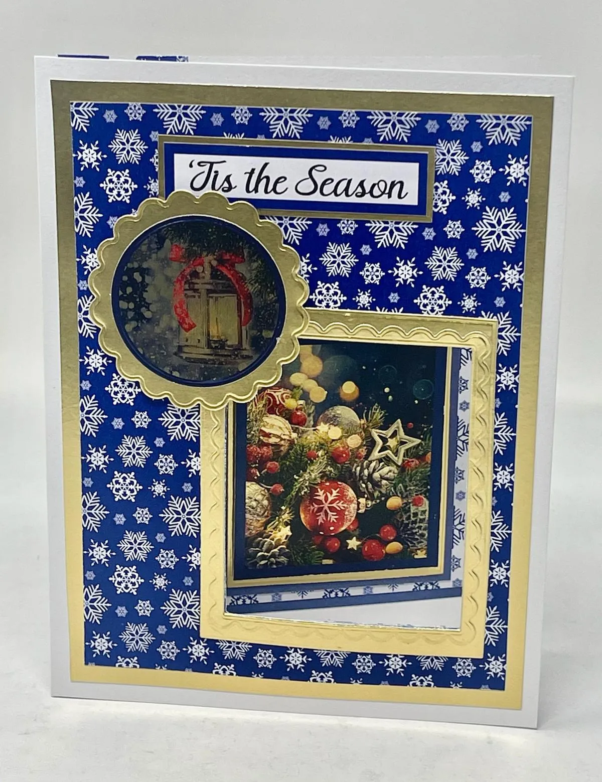3. Cut out the white/blue “’tis the season” greeting and mat it on Gold cardstock with 1/16" borders. Glue it centered near the card top. Die cut the Christmas Scenes gold lantern circle and a 2¼" scalloped circle from Gold cardstock. Glue the lantern to the scalloped circle, then foam tape it as shown.