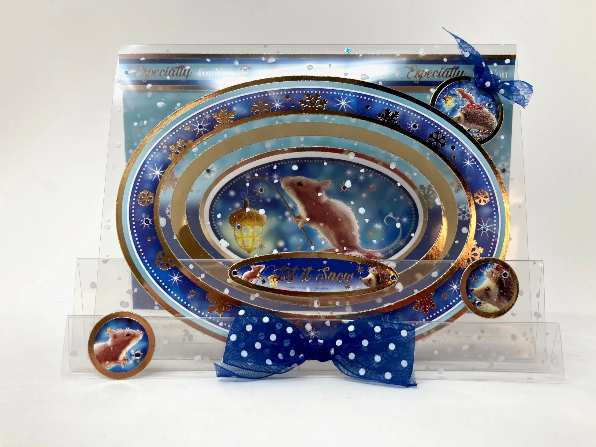 Select the "Coming Home for Christmas" Luxury Topper set and separate the oval frames featuring the mouse and lantern. Use Extra Sticky tape to place the outer frame on the front of the center stepper. Tape the "Let it Snow" sentiment 1/4" from the bottom of the frame. Tape the small mouse to the bottom step and the small hedgehog to the center frame. Make and Zot™️ a 2" wide blue ribbon to the bottom of the first step.