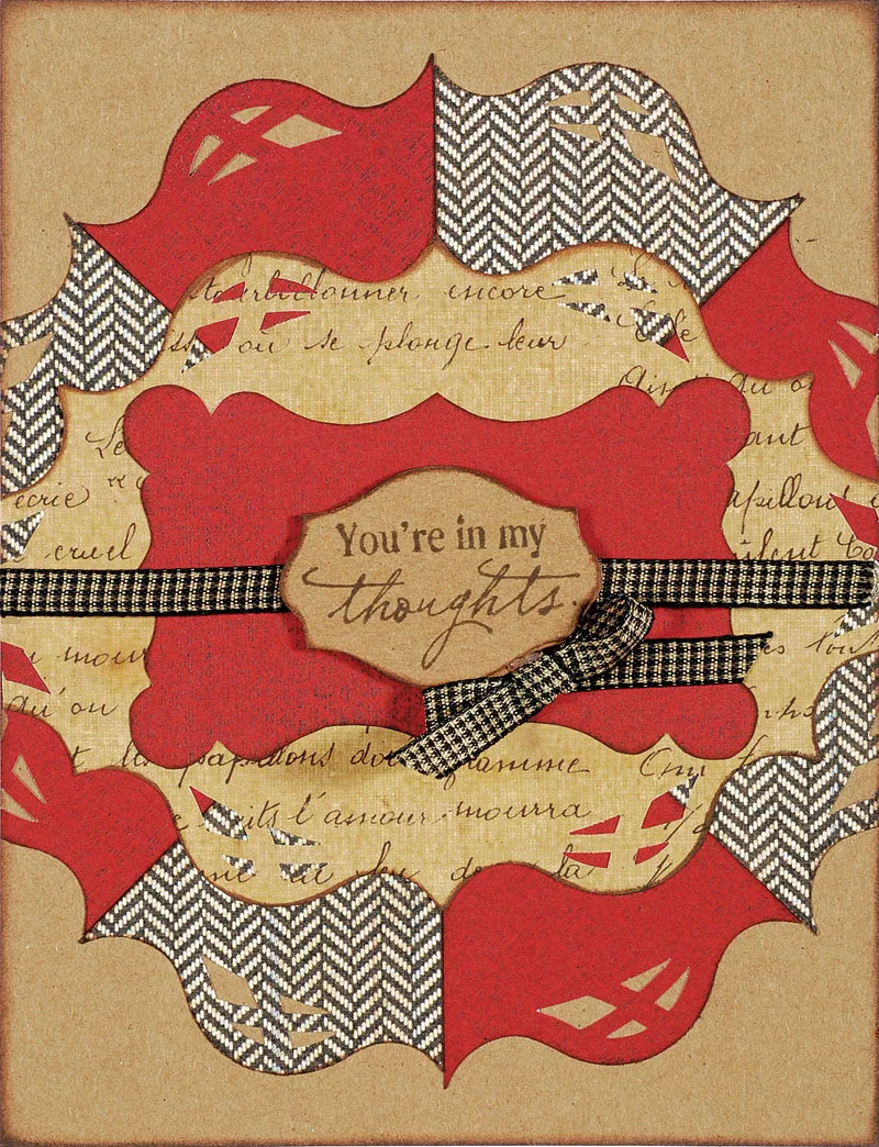 Cut a Bracket Sign from red texture and ink edges. Glue to center. Glue black/white gingham ribbon across the center with Zips™ adhesive lines. Cut an Oval Sign from Kraft cardstock and ink edges. Stamp a greeting in the center and foam tape to the center of the card. Zot™ a small bow to the lower left of the greeting.