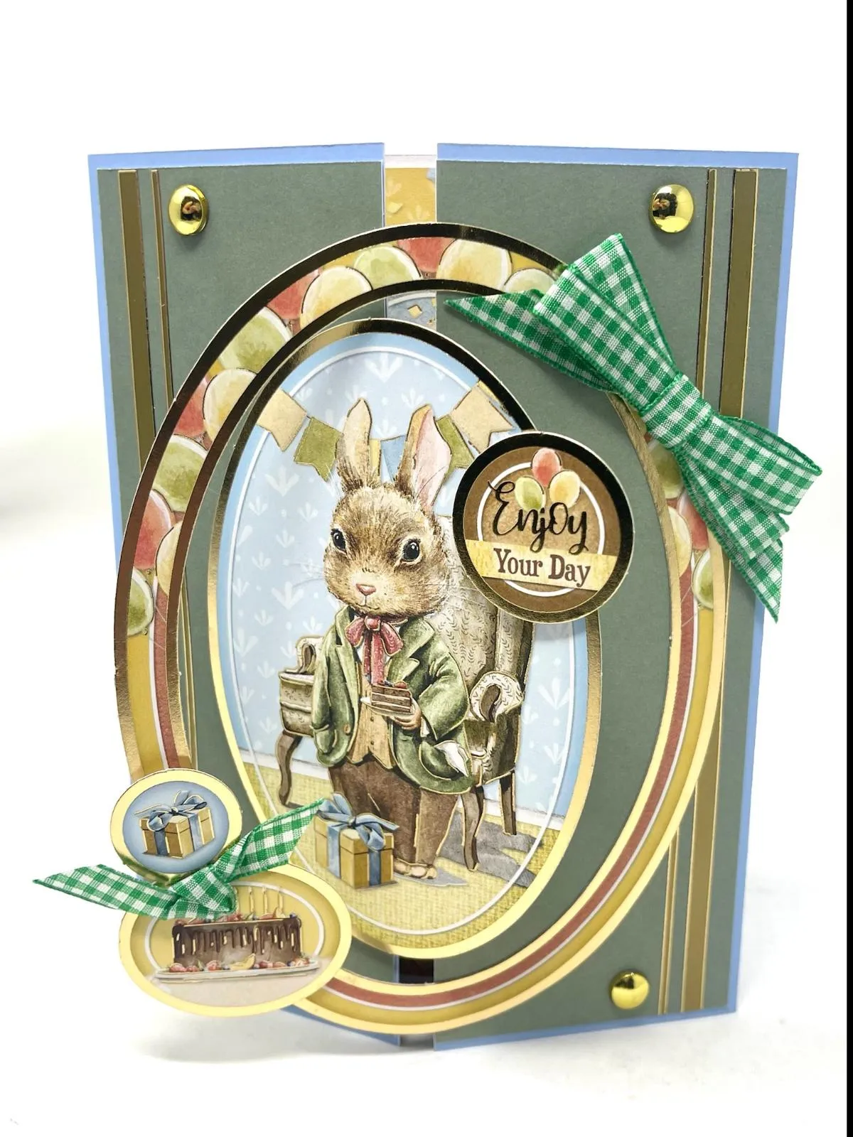 4 1/2"x6" green Adorable Scorable and cut down the center making two 2 ¼”x6” pieces. Glue to each side, flush to the center. Place Straight Line Dazzles™️ along outer sides as shown. Select the "Birthday Bunnies" Topper sheet and remove the large oval boy bunny image and the center oval. Glue the outer frame to only the right card side and the oval to only the left side. Foam tape the small Toppers along outer frame as shown and foam tape "Enjoy your day" to the oval as shown. Zot™️ a 2 1/2" wide bow and ribbon knot as shown. Position Diamond Sparkles Gold Studs in the corners.
