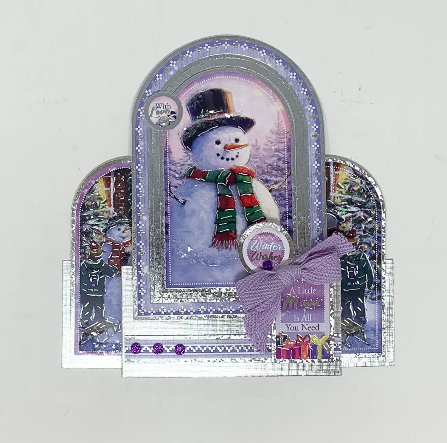 Cut 2”x12” strip of Silver Linen. Score from the left at 2 1/2&rdquo,; 4&rdquo,; 8&rdquo,; 9 1/2”. Fold the middle scores in mountain folds and the outer scores in valley folds. Glue the smaller arched toppers to the end panels so each snowman faces the center panel. Glue the largest and next largest arches around the foiled snowman to the back of the matching insert so the snowman scene shows. Foam tape the snowman center piece in the middle. Then foam tape it to the Silver Linen centered on the strip. Glue the border below the center area and place 3 small purple Diamond Sparkles along the left. Foam tape the sentiment Toppers and place Diamond Sparkles then Zot™ a 2” wide bow as shown. Unfold and brush on or dab Specialist glue to the snowy areas and sprinkle Diamond Dust on top for glistening snow. Tap off any excess and return to the jar.