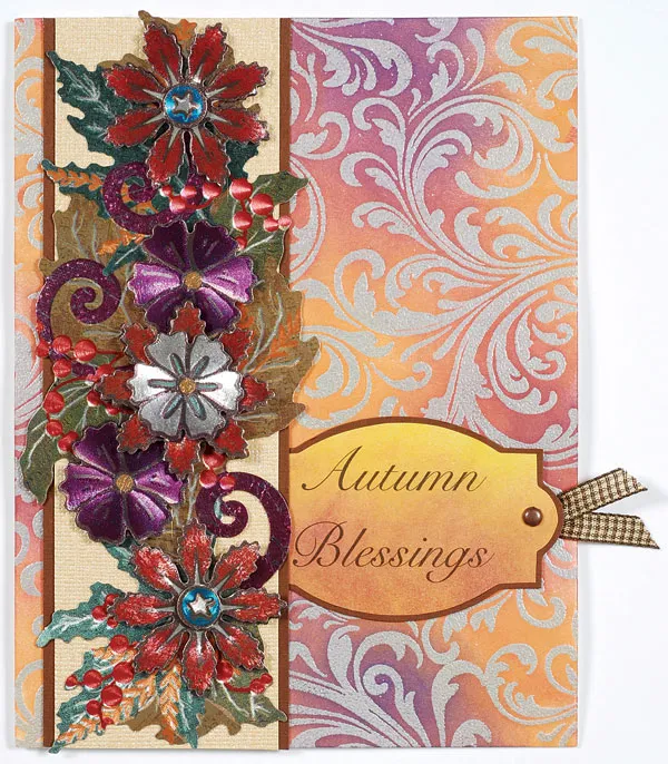 For the inside: Cut 4"x5" Color Me Silver flourish paper and repeat the inking process, adding glacier ink in two areas. When dry, mat on brown cardstock with 1/16" borders, then glue centered on the inside. Trace rounded label A around the printed sentiment and cut out. Mat on gold cardstock with 1/32" borders. Insert a mini brad in each end, wrapping a 1½" brown gingham ribbon around the prongs before flattening. Glue the label to the inside center, then punch and foam tape two papier tole extra art pieces as shown.