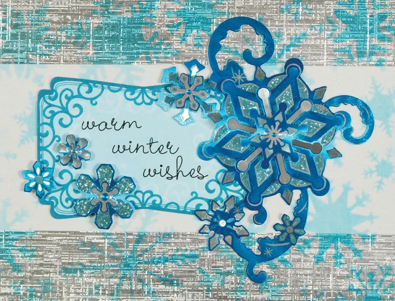 For the inside: Glue 6 1/2”x1 1/2” of silver linen paper across the top. Print a greeting on a blue label and glue 1 1/2” from the top and 3/4” from the right. Glue the first layer of the snowflake border across the top, going off the right side of the card by 1/2”; trim excess. Glue single snowflakes scattered as shown.