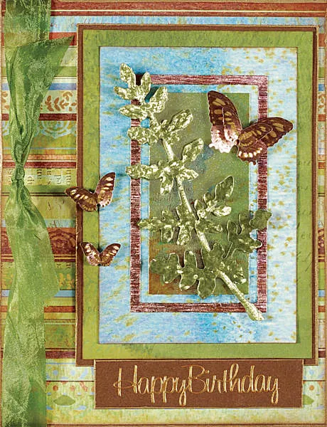 Glue a 2 ½” wide striped rectangle even with the right edge of the inside. Ink edges brown. Glue tag overlapping the striped paper. Add extra art from the die-cut sheet and ribbon as shown.