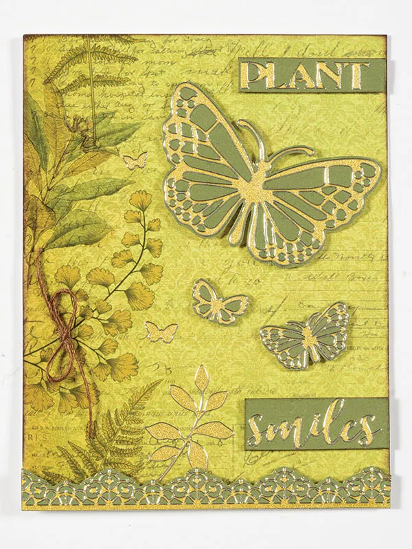 Place your card with the fold at the left. Cover the card with green/brown foliage border paper so the border is on the left side of the card. Ink the edges brown. Place Gardener’s Journal Scrapbooking Dazzles™ two tiny butterflies and leaf sprig near the foliage border on the card as shown. Back the Dazzles™ larger butterflies that you will be using, and a border on green cardstock, leaving a thin border around the edges. Foam tape the butterflies angled on the card front. Foam tape the border even with the bottom of the card.