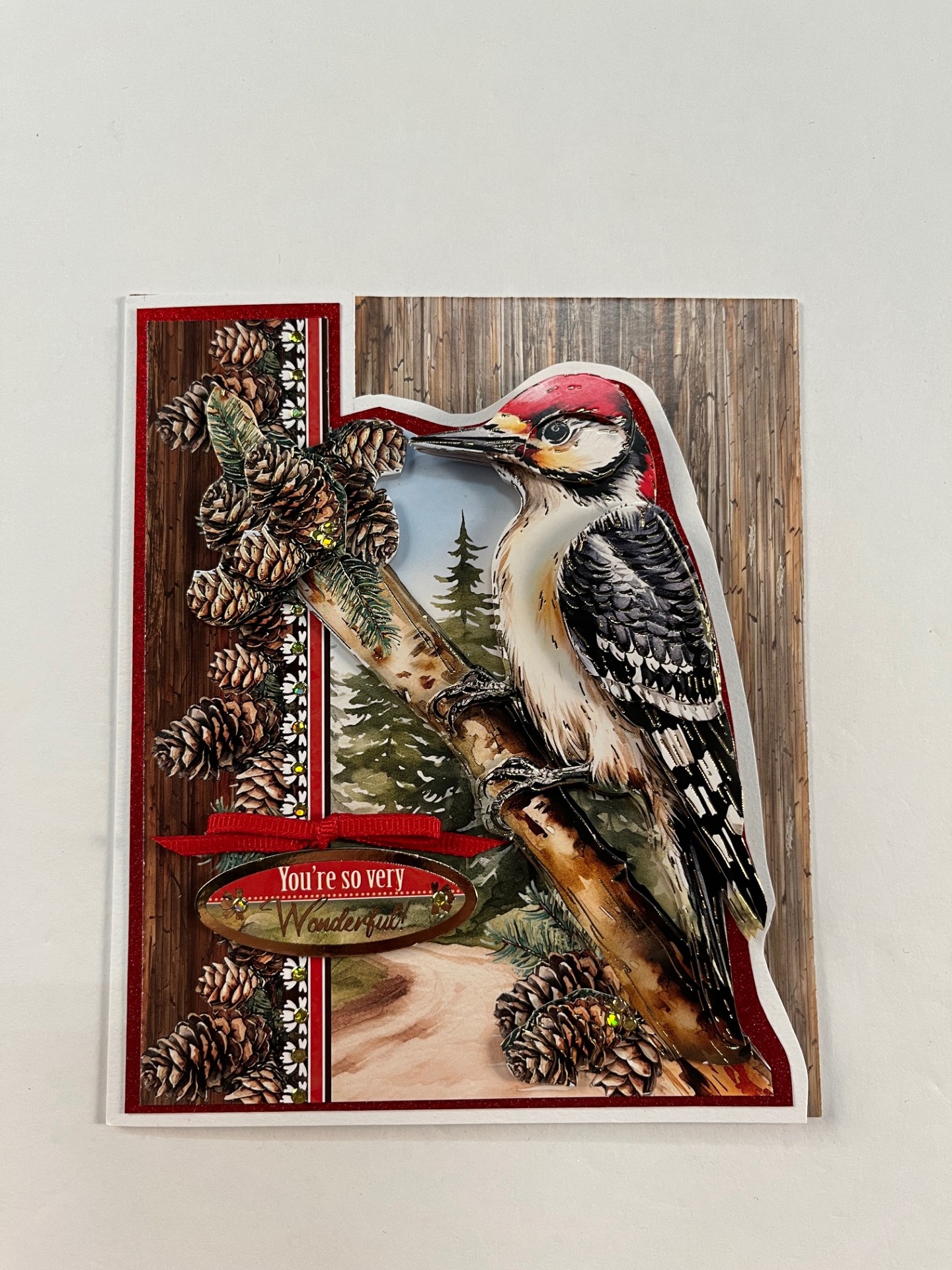 Select the woodpecker Adorable Scoreable. With the blank card oriented so the fold is on the left, cut the Adorable Scoreable to 4 1/2”x5 1/2” beginning at the left of the pinecone border going to the edge of the tree branch. Trim along the woodpecker on the right side from the bottom to the border. Trim the top of the border to 1 1/4” wide. Tape this woodpecker piece to the Red Brushed Diamond paper then trim 1/8” around leaving 1/8” red borders. Tape this to card front trimming around Red Brushed Diamond Paper leaving 1/8” white borders.