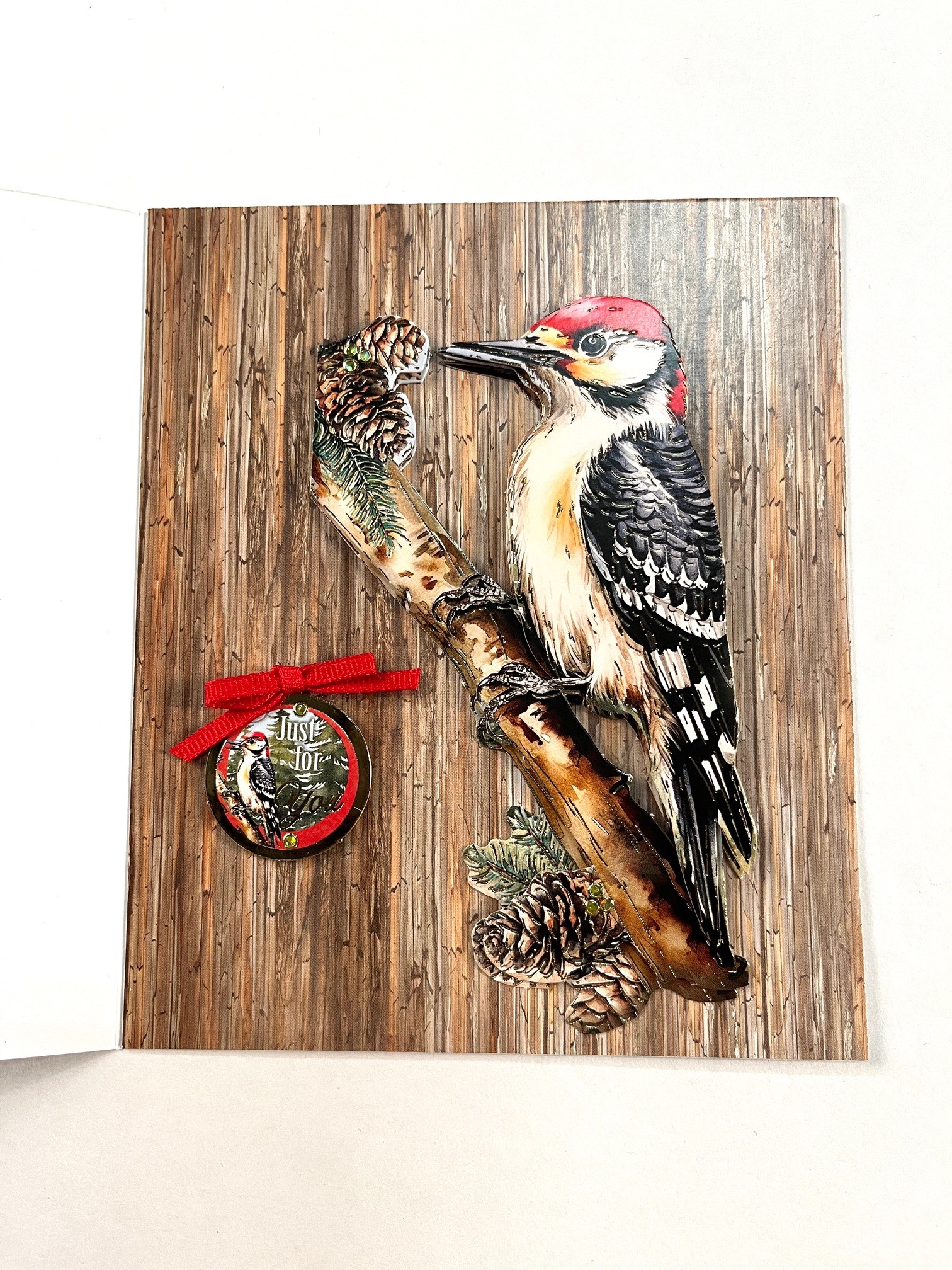 Card inside: Place tape on inside then lay the Adorable Scoreable flush to fold and one side, turn over then trim off the excess. Foam tape branch and bird layer 1” from right side and 1” from the top. Foam tape another woodpecker on top of that. Foam tape “Just for You” to the bottom left. Place Dazzles™️ as shown. Make and Zot™ a red bow on top of the circle.