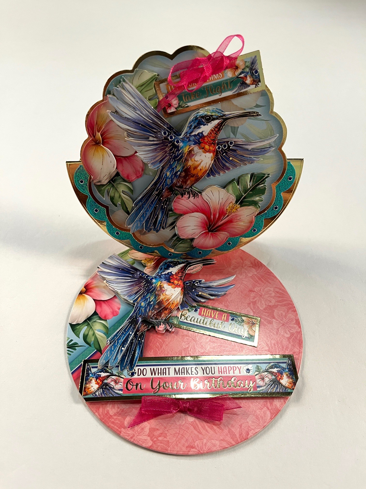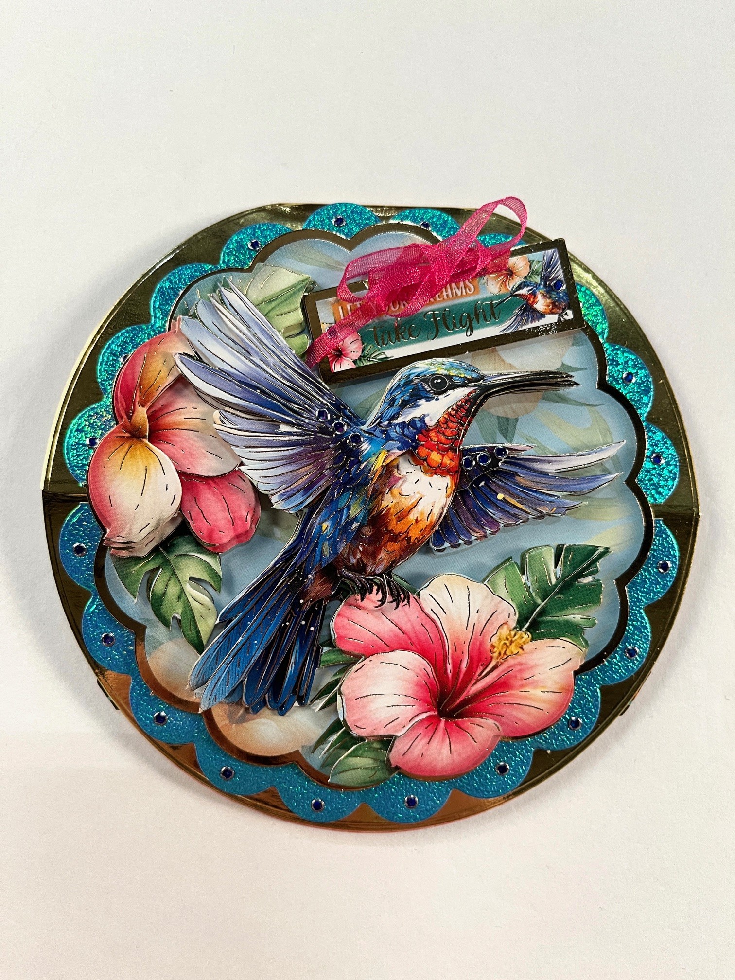 Cut and fold 10”x5 1/2” gold Miri. Place a 5” circular die just over the folded edge to create the hinge. Score just the top layer at 2 1/2” to create an easel card. Die cut a 4 3/4” scalloped circle out of blue iridescent paper. Cut in half and tape to each side of the folded easel area. Construct the hummingbird from the “Happy Hummingbird” collection on the provided base and foam tape the bottom to the bottom of the easel saving two of the bird layers for the inside. Foam tape “Let your dreams take Flight” as shown. Make and Zot™️ a 1 1/2” wide bow from the Magenta/Dark Ribbon Set and place above the sentiment.