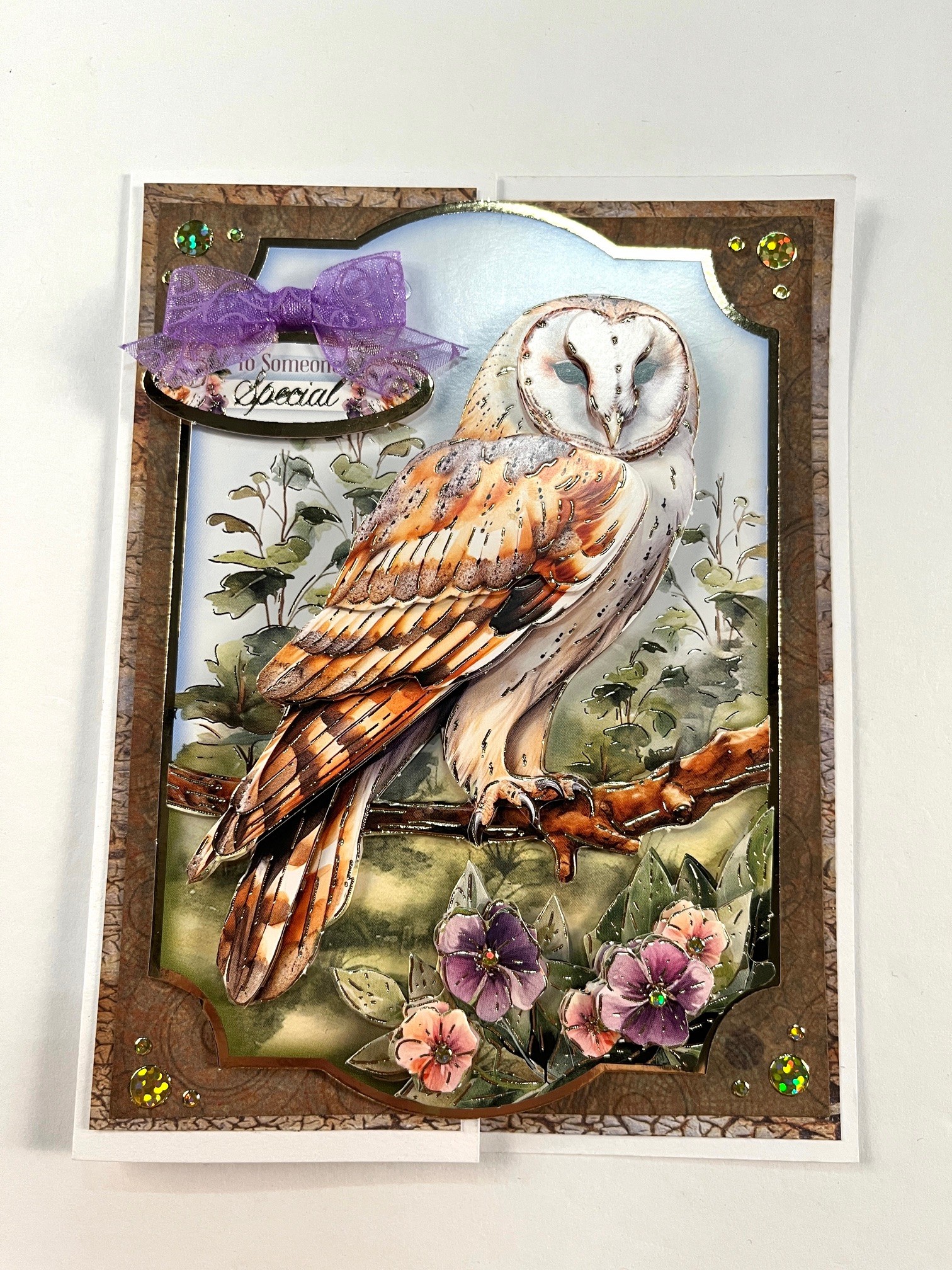 Construct the owl onto the included base from the “Beautiful Barn Owl” collection and save the large owl layer for the inside. Foam tape the left side of the base piece to the left side of the card. Foam tape “To Someone Special” sentiment to top left corner. Make and Zot™️ a 1 1/2” wide bow from the Purple Ribbon Set and place above the sentiment.