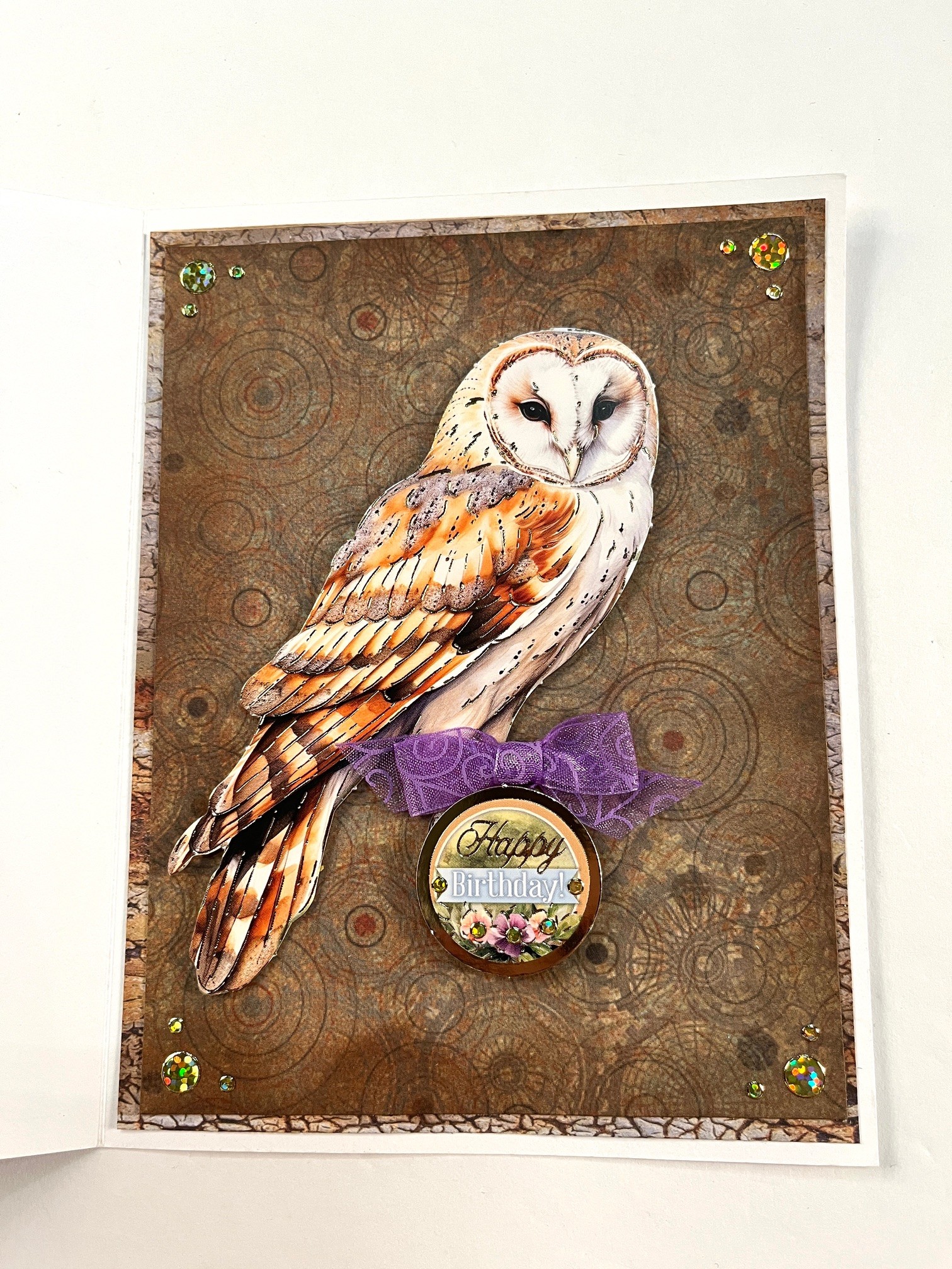 Card inside: On craft mat place a 4 ½”x5 7/8” gears 12”x 12” Steampunk For Everyone cardstock and color the edges with Prism Ink Pad velvet Fawn. Mat on lighter Steampunk with 1/8” borders. Tape to the card base leaving 1/8” white borders. Foam tape owl in the center and add double layer of foam tape to “Happy Birthday” sentiment. Make and Zot™️ a 2” wide bow from the Purple Ribbon Set and place above the sentiment. Place gold jewel Dazzles™️ in each corner as shown.