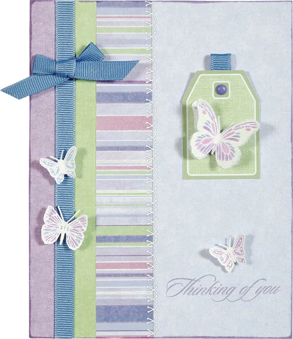 Cover the card front with the striped border paper. Cut out and glue 1/2" strips of green and purple to the left of the card, as shown. Glue a blue ribbon over the paper seams and Zot a bow to the top. Stamp "thinking of you" to the card front with purple ink.