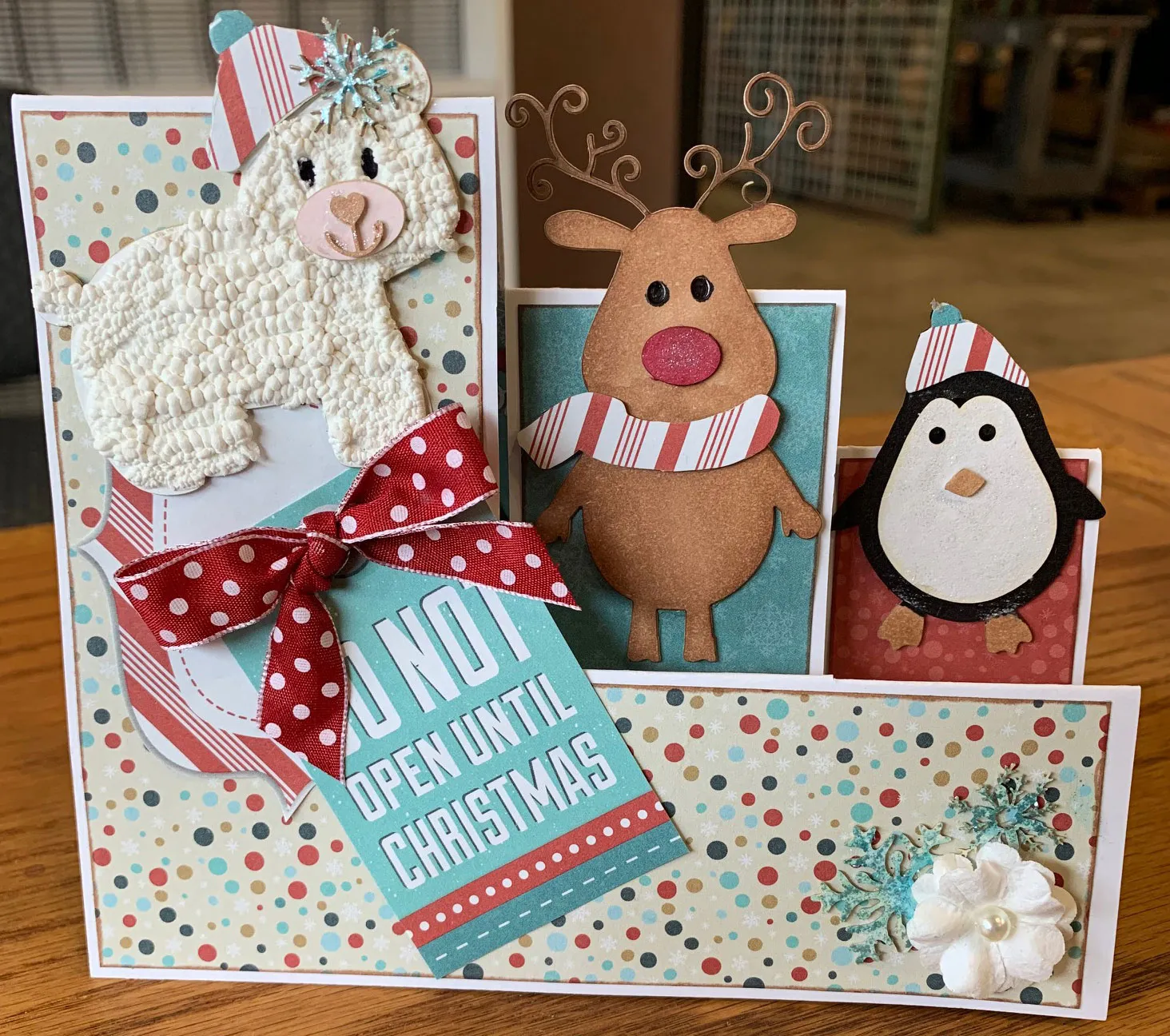 Glue the red stripe label cut out 1” from top of the left side of the card. Glue the “Do not open until Christmas” tag at an angle. Zot a red dotted bow to the label. Glue a white flower and two snowflakes covered in Luna Paste to the lower right corner.