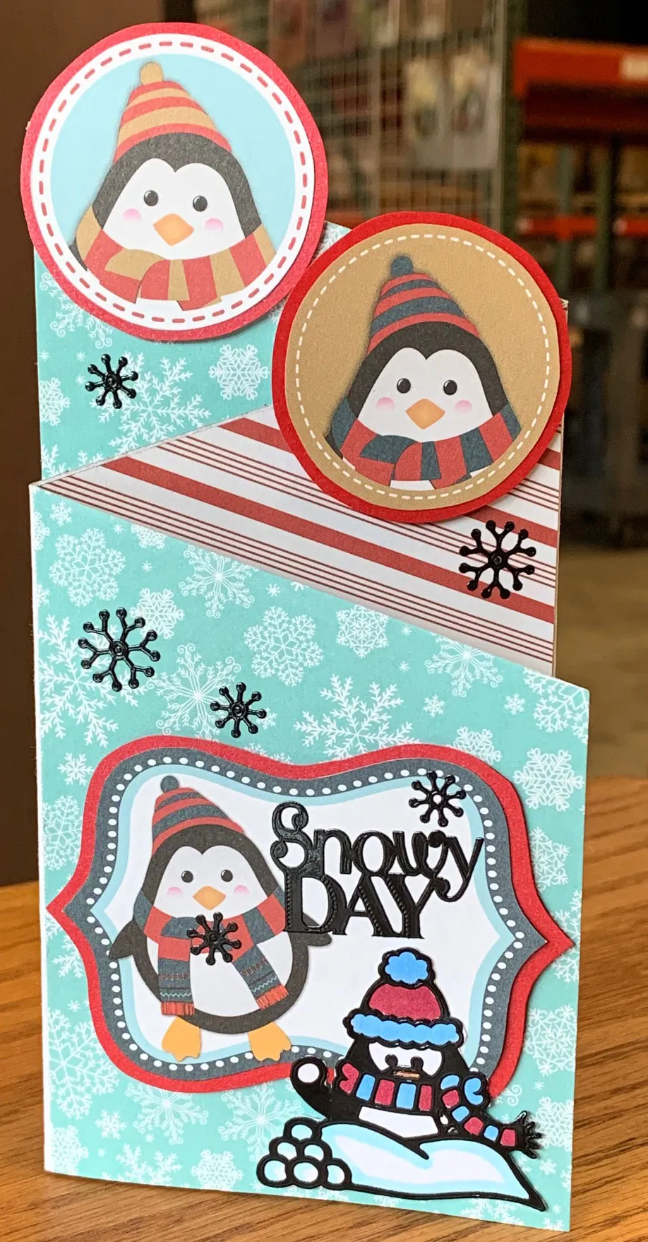 Middle panel back two candy cane and one gift Dazzles™ with Red Jupiter Glimmer paper and glue to lower center. On the shortest panel trim out the penguin label cut outs and mat on Red Glimmer paper with 1/16” borders. Foam tape to the center. Add three snowflake Dazzles™. Place Penguin with snowballs Dazzle ™ onto white cardstock and color in with blue and red Tri Blend™ Markers. Cut out and foam tape to front. Add Dazzles™ greeting.