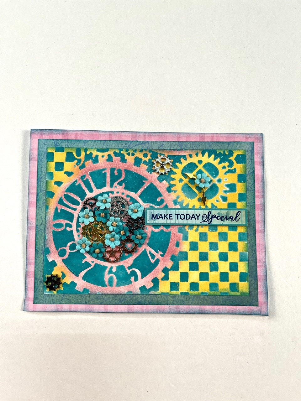 Cut the cardstock down to 5.5”x4”. Mat on Teal then Pink Plaid cardstocks.