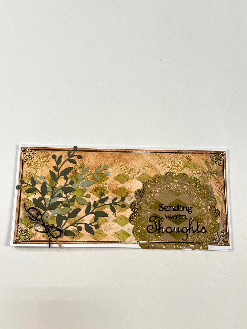 After cutting background paper to size, ink edges with cocoa bean ink and stencil diamonds with khaki ink as shown. Use the sponge on blending tool to apply Tacky-When-Dry Gel lightly through the stencil and over the khaki colored diamonds. Remove stencil and place in water until it can be cleaned. Also add Gel to edge of Kraft Doily and then apply gold foil to diamonds and doily.
