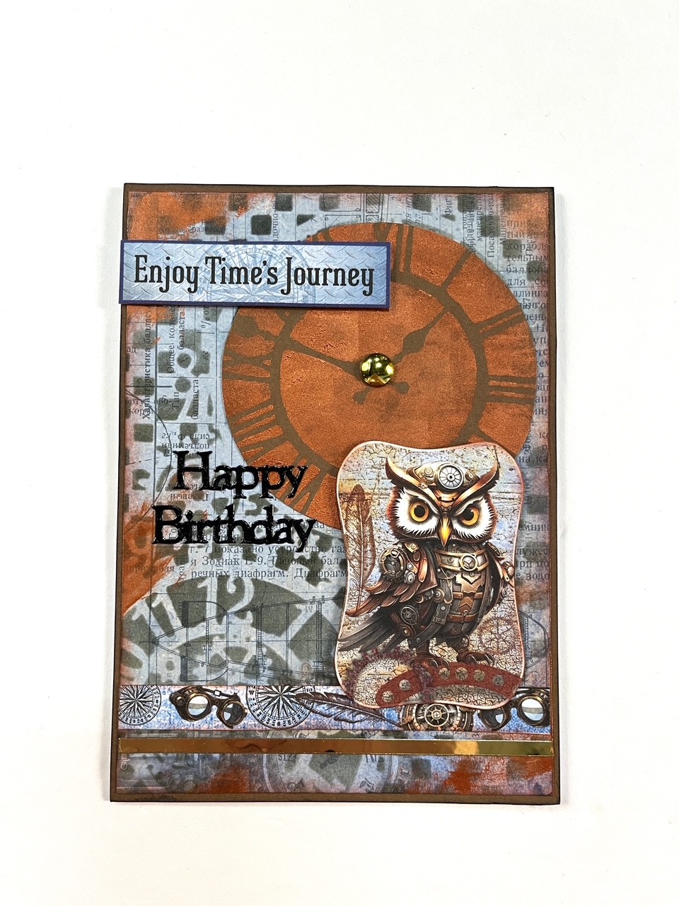 Place stencil over blue Steampunk paper and use blender to apply charcoal ink. Glue to the brown cardstock covered card. Use sponger dauber to apply a thin coat of Copper Penny Stencil Butter over brown Solid Cardstock. Let dry and glue the copper clock over the black stenciled clock. Smudge Stencil Butter to the card edges and let dry.