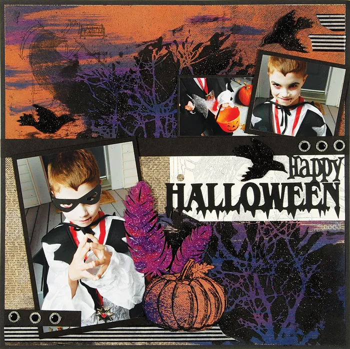 Photos: There are three photos for this layout measuring 4”x6&rdquo,; 2 1/2”x2 1/2&rdquo,; and 3”x2”. Mat photos on black cardstock with ¼” borders. (The black mask from the Halloween Dazzles™ was used in the 4”x6” photo. Try adding it to one of your photos for an instant costume.)