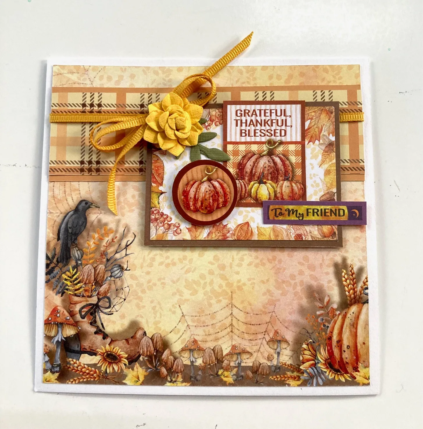 3. Cut out the “grateful, thankful, blessed” label and glue it to the blank label at the upper right. Foam tape the pumpkin circle die-cut and glue the “to my friend” label as shown.