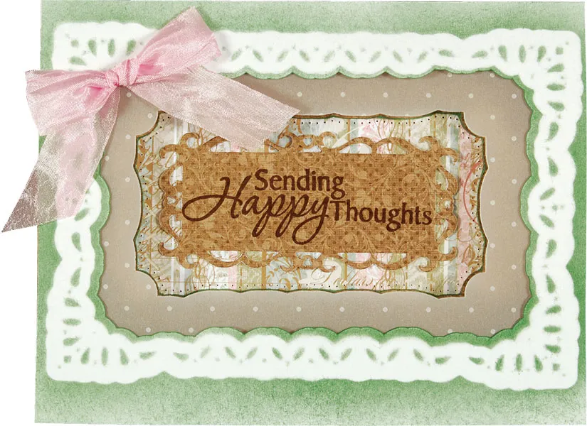 Open the card and place the 5” long rectangle at the center under one side of the card. Close the card so that the die is sandwiched between the card. Run the card through the Epic 6 machine, and remove die to expose the negative border, which has created a window. Open the card and lay flat. Place the largest 6 1/4” long die, centered over the window and stipple green over the die and card edges. Remove the die and clean.