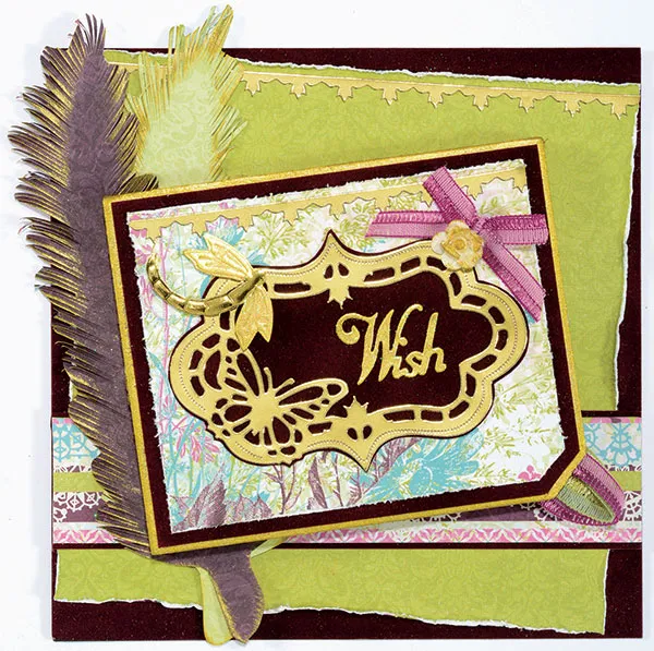 Card base: Back 5”x5” burgundy suede on black cardstock. Sand and distress the edges of 4 5/8”x4 5/8” Unforgettable chartreuse paper and glue at an angle, as shown. Place gold border Dazzles™ 1/8” from the top edge of the chartreuse paper. Mat the long edges of 5”x1” Unforgettable stripe paper on suede with 1/16” borders and glue ¾” from the bottom edge of the panel.