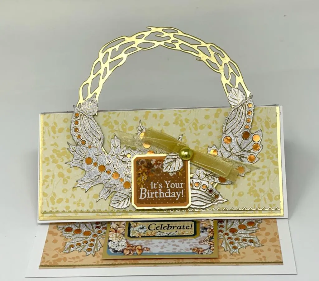 2. Place one gold thin line Dazzles™ near the lower edge of the front and two near the upper edge, trimming the excess. Die cut the wreath twice from Gold cardstock and glue them together, matching the vines. Center the wreath on the front and glue it just to the lower front.