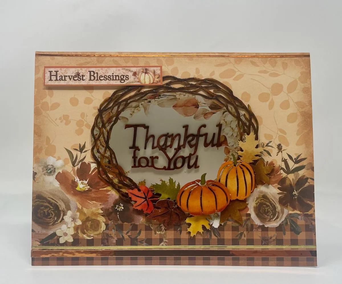 4. For the inside: Cut the Autumn Garden wreath cutout shown to 5⅛"x4" and mat it on medium brown cardstock with ⅛" borders. Glue it to the inside so the center area is just behind the window when the card is closed.