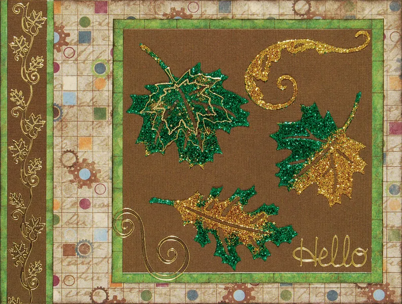 Place the double stick leaves and swirl on the brown square, arranged as shown. Sprinkle gold glitter on portions of leaves and swirl as indicated in the photo. Tap off the excess glitter and pour it back into the container. Add emerald glitter to remaining areas of the leaves, tap off excess and pour back into the container. Add a non-stitched leaf dazzle sticker centered over the large glittered leaf. Add a swirl from the stitched dazzles sheet, and “Hello” sticker in the lower right corner.
