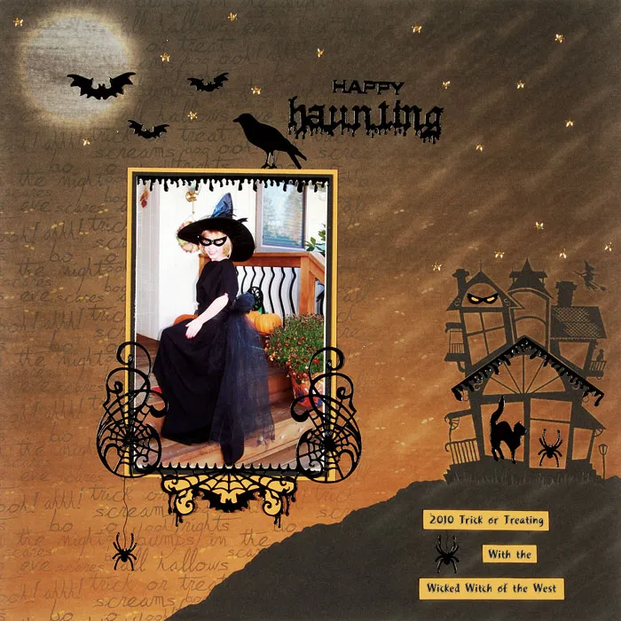Adhere “Happy Haunting” Dazzles™ above the photo and to the right. Adhere 3 bats to the left and the crow on top of the photo mat. Adhere tiny gold star Dazzles™ in the night sky.