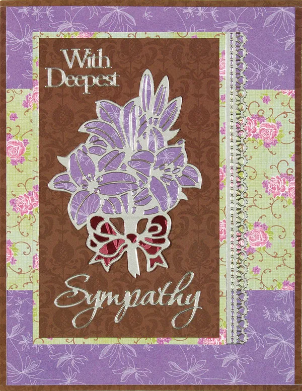 Adhere a gold border 1 ¼” from the bottom edge. Trace an Art Deco label onto light green and mat with glimmer, leaving a 1/16” border. Adhere “With Deepest Sympathy” to the label and foam tape over the Dazzles™ gold border.