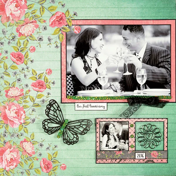 Step #1 Photos Both pages: Mat all black and white photos on black cardstock with 1/16” borders. Mat again on Charming pink textured paper with 1/4” borders, then again on black with 1/16” borders. Left page: Place the matted 7”x5” photo on the Charming aqua striped/floral border background paper, even with the right side and 1 1/4" from the top--but don’t glue it in place yet. Crop a photo to a 2 1/4" square and reserve for the kraft mini journal frame. Right page: Place one matted 6”x4” photo on the Charming aqua/pink floral paper 1 1/4” from the left side and 1 1/8” from the top, but don’t glue in place yet. Center the remaining 6”x4” matted photo 1/2" below the first one, but don’t glue it. Crop a photo to a 2 1/4" square and reserve for the kraft mini journal frame.