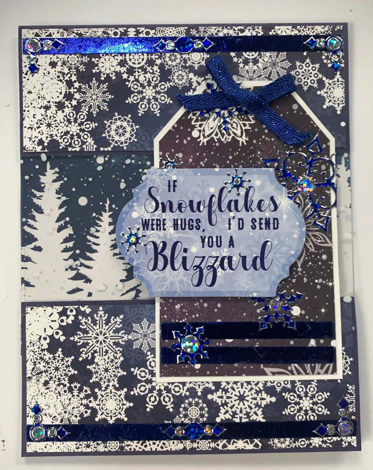 Attach the tag to the front as shown using 2-sided tape. Place blue mirror snowflake Dazzles™ on the tag as shown and decorate them with the silver jewel Dazzles™. Foam tape the Snowfall “if snowflakes were hugs…” die-cut on the tag, extending off the left edge.