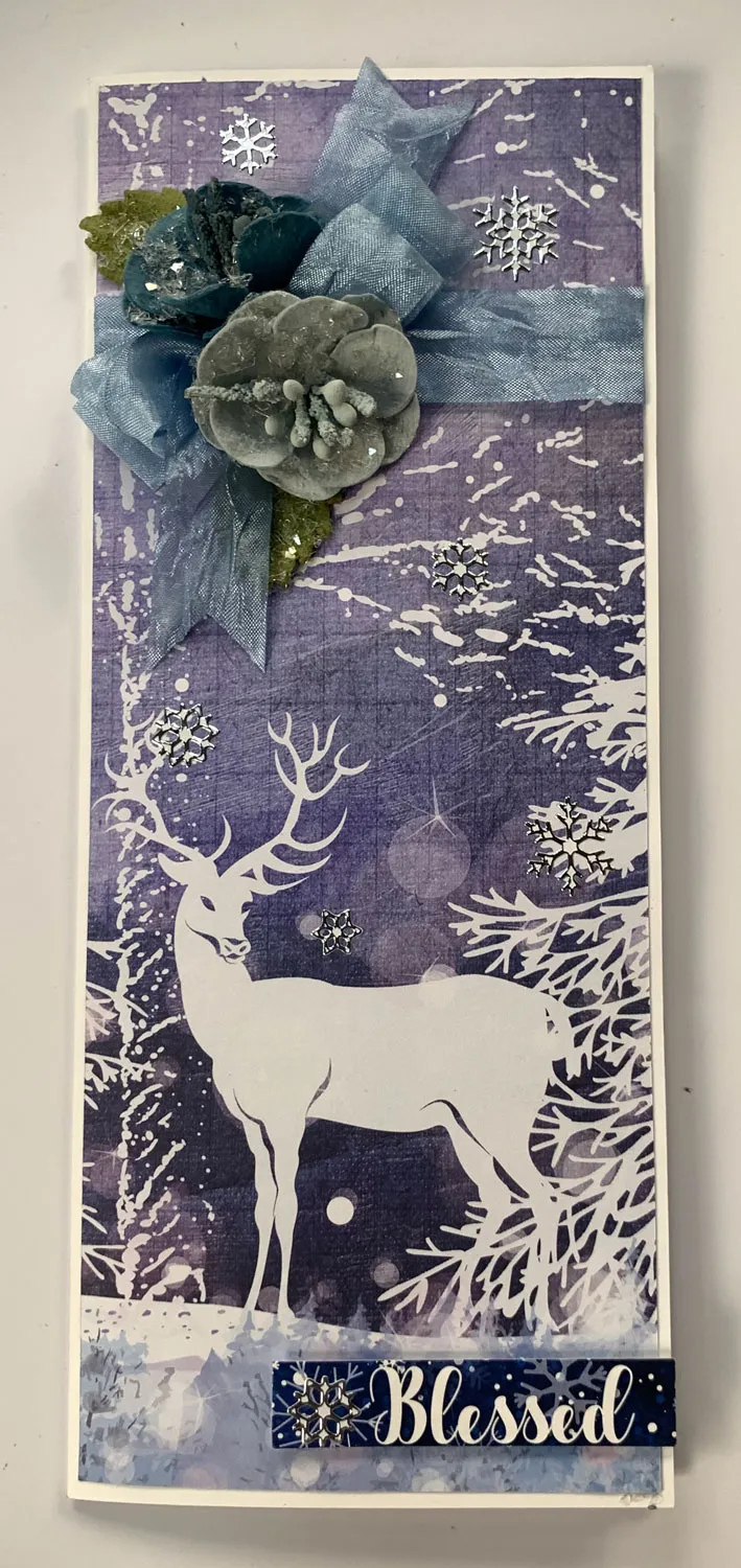For the front: Cut 3¼"x8¼" Snowfall deer/forest paper, with the deer positioned as shown. Wrap a 4½" length of light blue crepe ribbon across the paper, 1 3/8" from the top, and secure the ends to the back. Glue the paper centered on the front panel.
