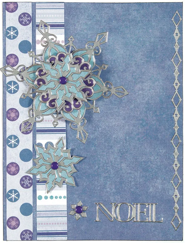Cut a 4 3/4"x6 1/4" piece of medium blue paper and ink the edges. Attach 3/4" strips of snowflake dot and striped paper to the left side. Place the large snowflake Dazzle™ overlapping the strips, as shown. Back the smaller Dazzles™ with light blue and purple paper and layer over the large on with foam tape. Place a brad in the center of the top layer.