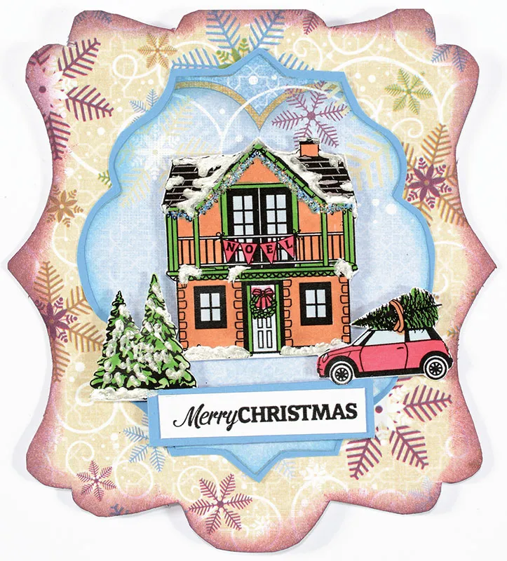 Stamp the brick house, car, and fir trees on white cardstock in black ink. Color as follows: House-TN4, CG4, IG5, CR8, Car-CR8, CG4, Trees LG4, CG4. Cut close to the edge of each image. Foam tape each to the card front. Apply Liquid Pearls on the snow areas, and Stickles to the Christmas Lights.