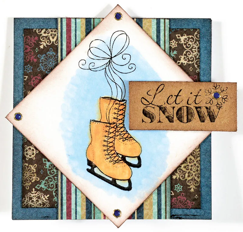 Use black ink to stamp Ice Skater pair of skates on the center of 1 7/8” white cardstock placed on point. Color the Skates with Spectrum Noir Pale Hues TN2 and shade around the outside of the skates with Spectrum Noir Blues TB Use the Blender Pen to soften the blue edges. Glue white cardstock square to the card front, as shown. Stamp Ice Skater “Let It Snow” onto kraft color cardstock and cut to 1 3/8”x5/8”. Ink edges brown and foam tape to the right side of the card as shown. Embellish white cardstock points and the snowflake on the greeting with Blue Jewel Dazzles™.