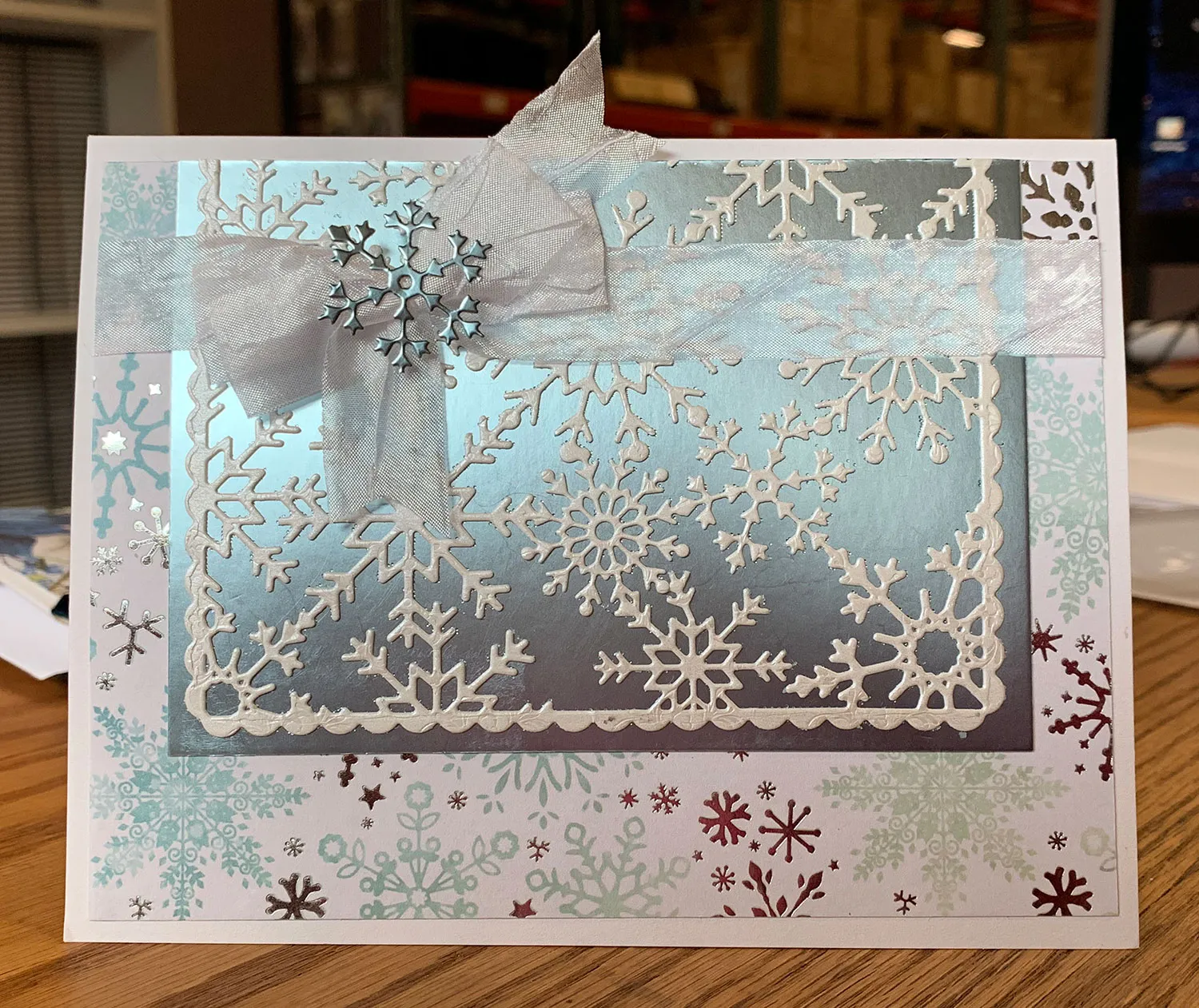 Die cut the dendritic crystals from light blue mirror cardstock. Carefully cut the snowflakes apart, trimming off the outer frame. Glue a 1 1/8" wide snowflake to the bow center and save the remaining flakes for the inside.