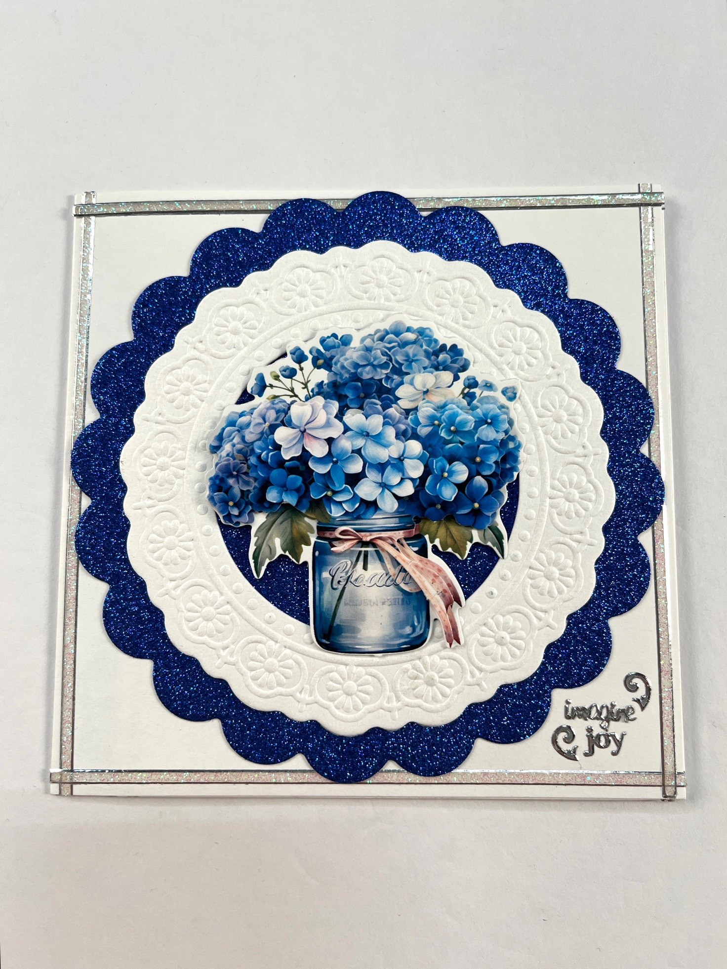 Cut two cards down to 5” square. Glue the back of one to the inside of another forming a three-panel card. Trim the third panel to be 4 ½” wide. For the card front: Place glitter Dazzles™ 1/8” in from the edge on each side of the card. Use the 4 ¾” wide scalloped die with blue glitter cardstock to cut one piece. Glue in the center of the card. Glue or tape an embossed round die-cut in the center. Glue #1 jar die-cut in the center. Foam tape #3 over the matching art. Place “imagine”, “joy” and two curved line Dazzles™ in the lower right corner.