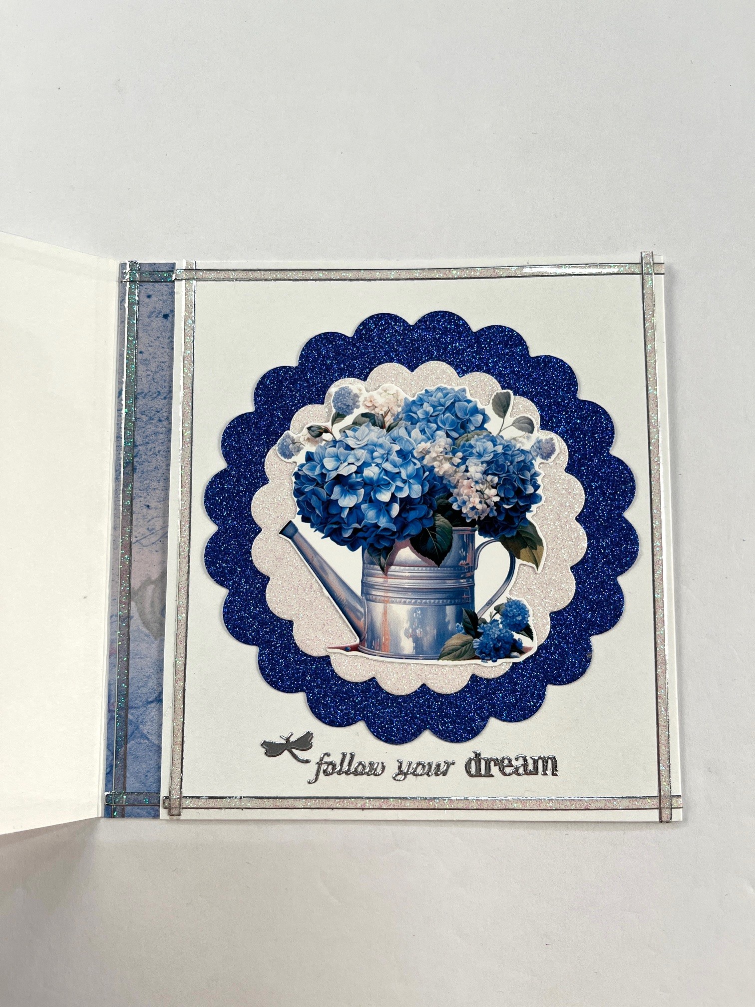 For the second panel: Place glitter Dazzles™ 1/8” in from the edge on each side of the card. Use 3 ¾” scalloped die with blue glitter cardstock to cut one piece and glue or tape to the center of the panel. Use the 3” scalloped die with white glitter cardstock to cut one piece. Tape to the center of the blue circle. Tape #1 watering can die-cut in the center. Place “follow your dream” and a dragonfly Dazzles™ at the bottom.
