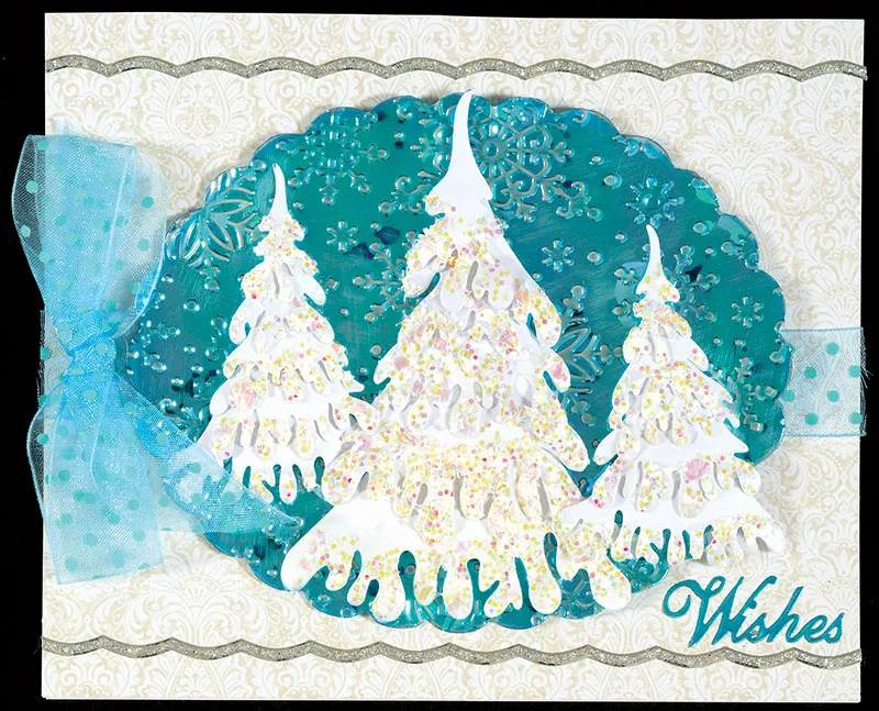 Begin with the largest bottom tree shape. Hold with a tweezers. Ink the bottom edge with VersaMark™ ink, and dip into the clear embossing powder. Heat until melted and while still hot, dip into the Spoonful of Snow. Heat again, from the bottom of the paper. If it did not leave enough “snow,” heat and dip again into the Spoonful of Snow. Heat again from the back to set. Repeat this procedure for each of the tree layers. Use Zots™ to assemble the tree layers to create one large tree and two small trees. Place foam tape down the center of each tree so it will retain its 3D shape, and place each tree onto the scalloped oval as shown. Color a “Wishes” Dazzles™ with Turquoise Spectrum Noir™ BT7. Place on the bottom right corner.