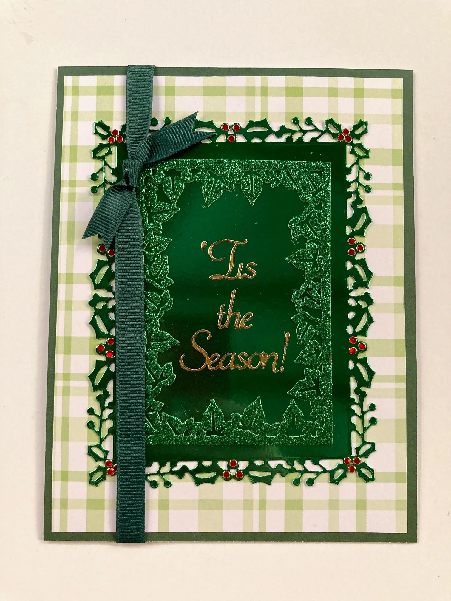 2. Center the ivy die inside the small rectangle die and cut it from glitter cardstock. Attach it to the center of the holly die-cut. Wrap ½" wide dark green grosgrain ribbon vertically 1" from the left edge, gluing the ends to the back. Glue the cardstock centered on the card front.