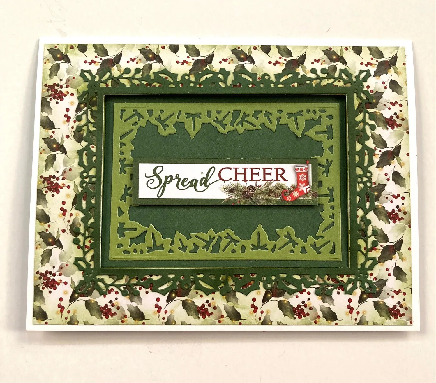 4. Die cut the holly die from light green cardstock and glue it to 5¼"x4" white cardstock. Die cut a large rectangle from dark green cardstock and glue it centered on the holly die-cut. Center the ivy die inside the small rectangle die and cut it from light green cardstock. Glue it centered on the dark green rectangle. Foam tape the “spread cheer” label cutout in the center.